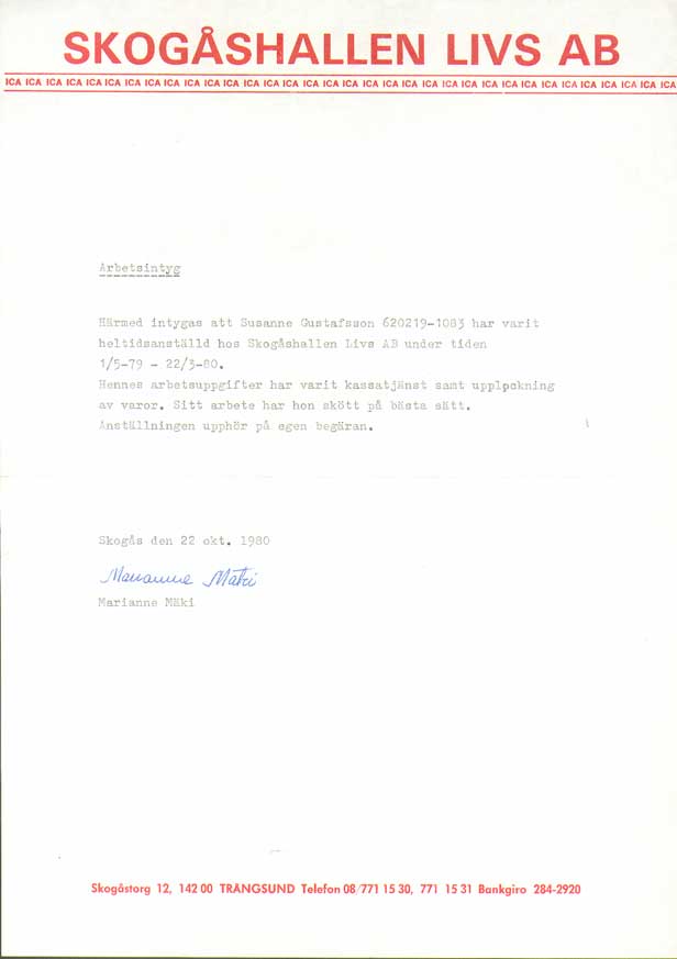 | ICA, Skogås | 790501--800322 | Kassörska | Arbetsintyg |