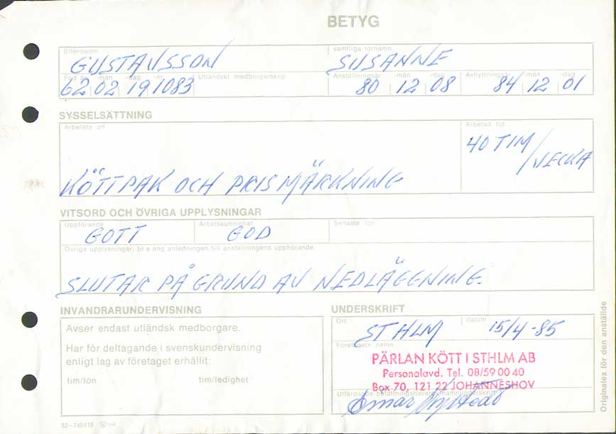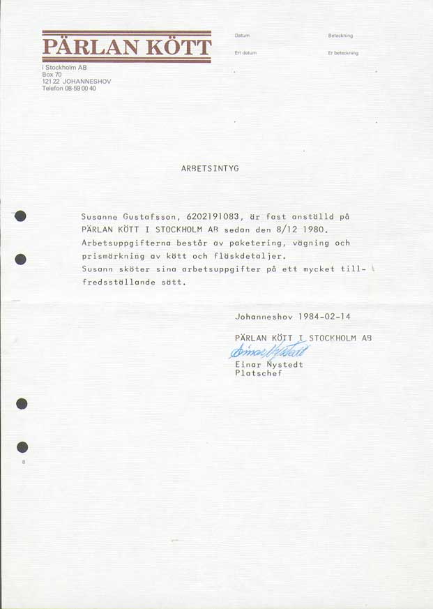 | Pärlan Kött AB | 801208--841201 | Paketering, vägning, prismärkning | Arbetsintyg, betyg, Uppsägningsbesked |